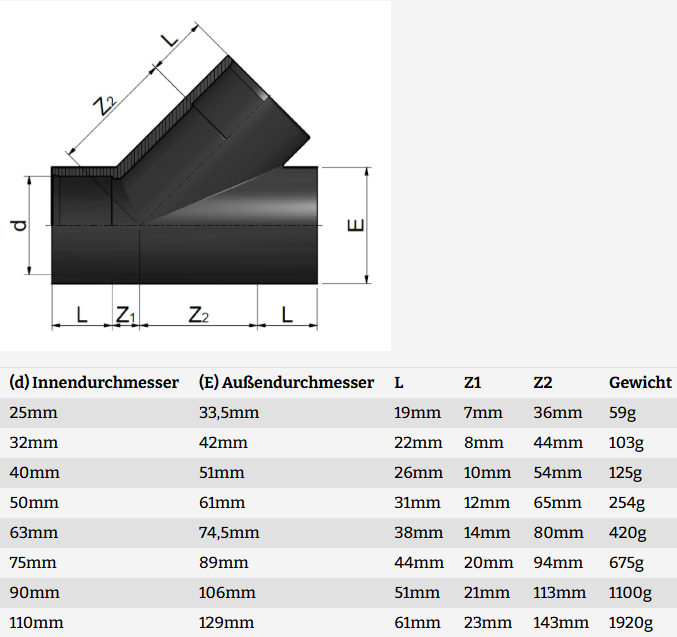 PVC T-Stück 45° grau, Klebemuffe